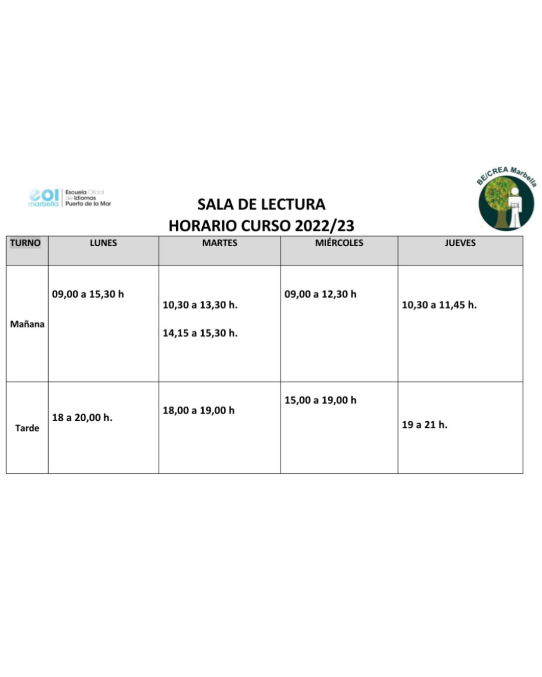 AMPLIAMOS HORARIO DE LA BIBLIOTECA por EOIMarbella | Feb 20, 2023 | NOVEDADES Gracias a nuestro maravilloso voluntariado de la biblioteca, contamos con un horario más amplio para que puedas hacer tus préstamos.