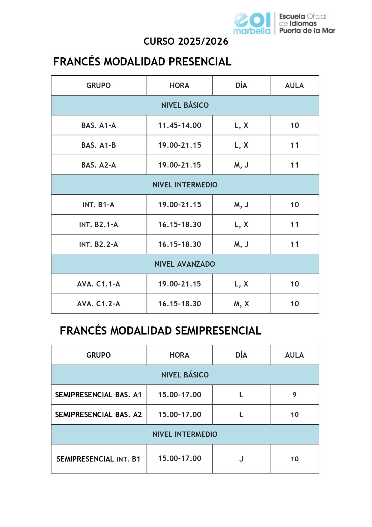 HORARIOS FRANCÉS CURSO 2025/2026 Los horarios publicados pueden sufrir modificaciones derivadas de la planificación del curso 2025-2026.