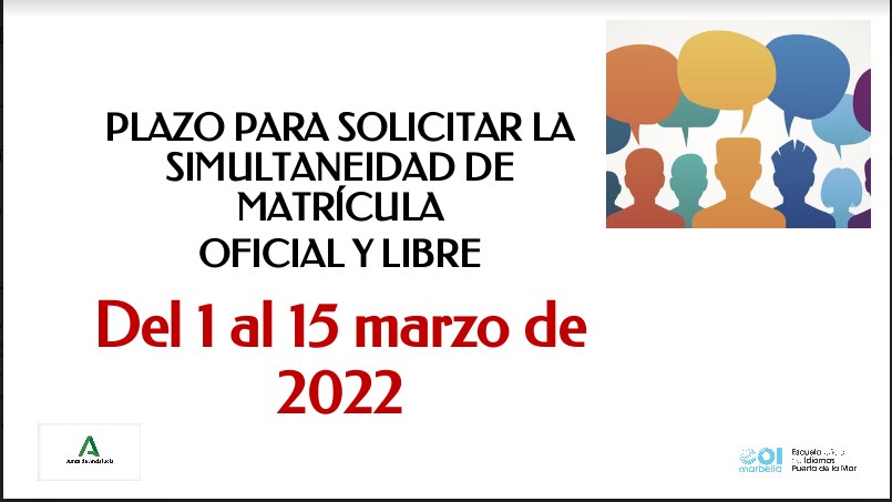 El alumnado oficial que se quiera examinar por libre de otro idioma distinto al que cursa, debe solicitar la simultaneidad de matrícula del 1 al 15 marzo 2022.