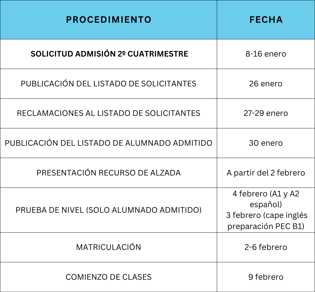 CALENDARIO ADMISIÓN 2º CUATRIMESTRE: A1 y A2 ESPAÑOL PARA EXTRANJEROS, CAPE PREPARACIÓN CERTIFICACIÓN B1 INGLÉS CALENDARIO GENERAL ADMISIÓN Y MATRÍCULA