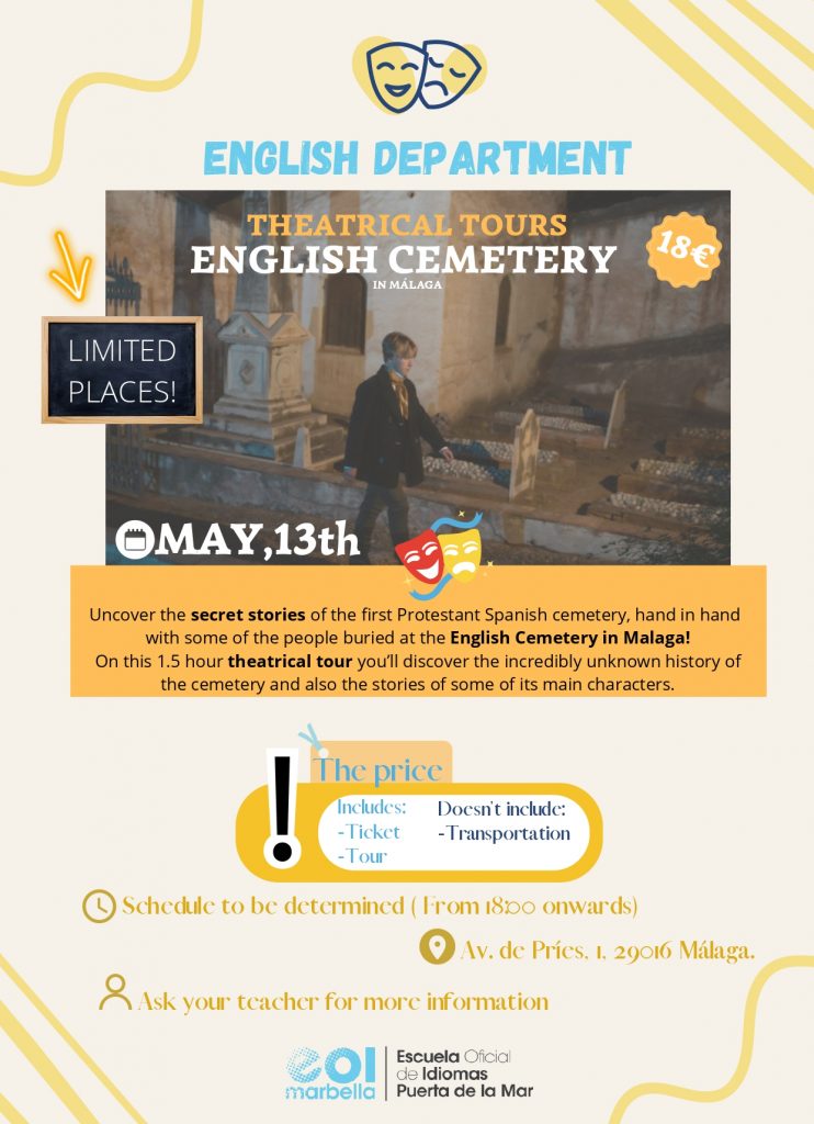 El 13 de Mayo nuestro departamento de inglés se va de visita al cementerio inglés de Málaga. Disfruta de esta hora y media de visita teatralizada y conoce las historias de este misterioso lugar en inglés. Si estás interesado/a, habla con tu profesor/a y realiza el pago antes del 5 mayo.